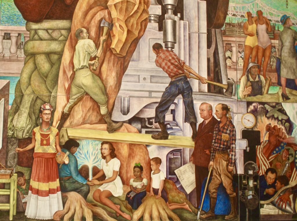 This giant five section piece was created some ten years after his first trip to the US and was the last mural he made there. In the centre, Kahlo is depicted, as is Rivera himself as well as a gentleman in a brown suit, carrying architectural plans; one Timothy Pflueger.