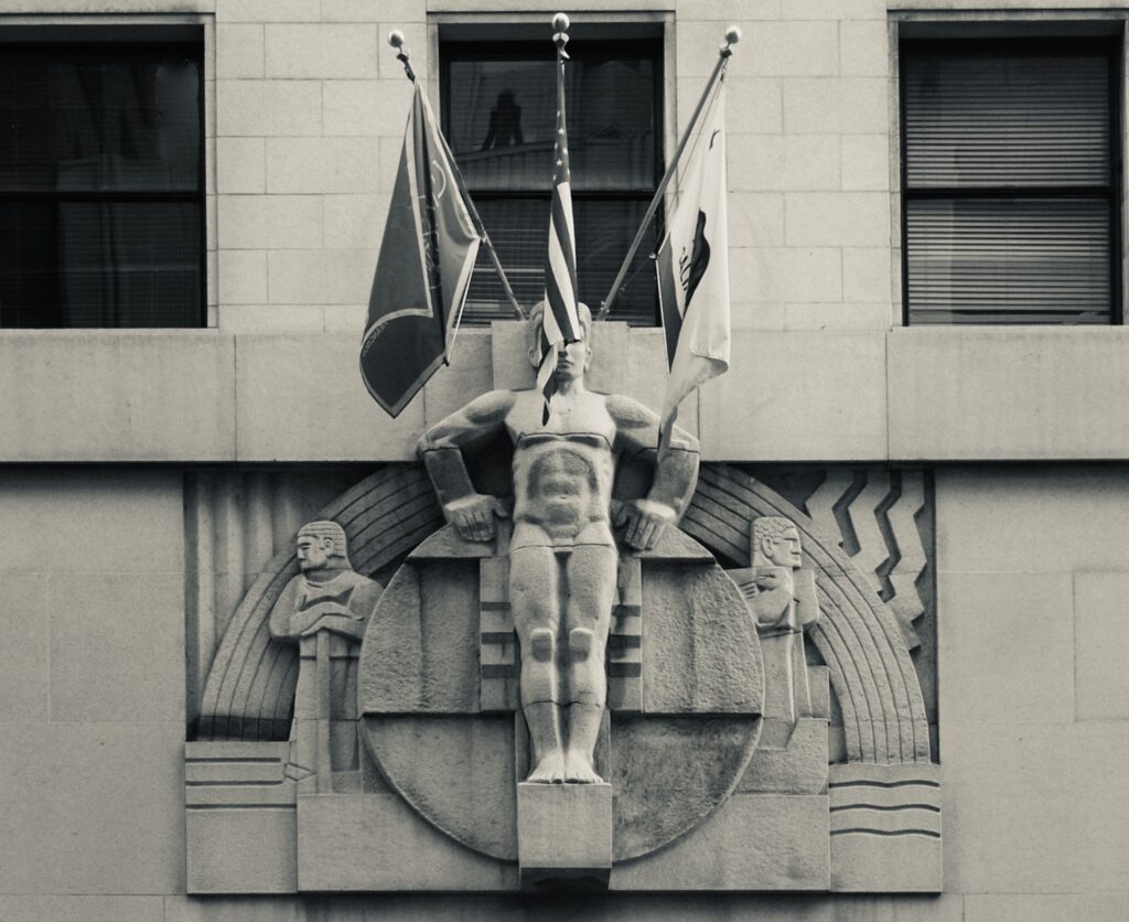 Most notable are the two spectacular external sculptures on either side of the building entrance. These were created in Yosemite granite by artist and sculpture Ralph Stackpole, a frequent collaborator with the architect Pflueger during the 1930s. These consist of grouping of female and male figures, respectively named Agriculture and Industry. Above the colonnade are two large medallions, similar to the one on the adjacent Tower. Again in a modern style, depicting female figures and images of railways and shipping. The tenant of the building today is a fitness company.