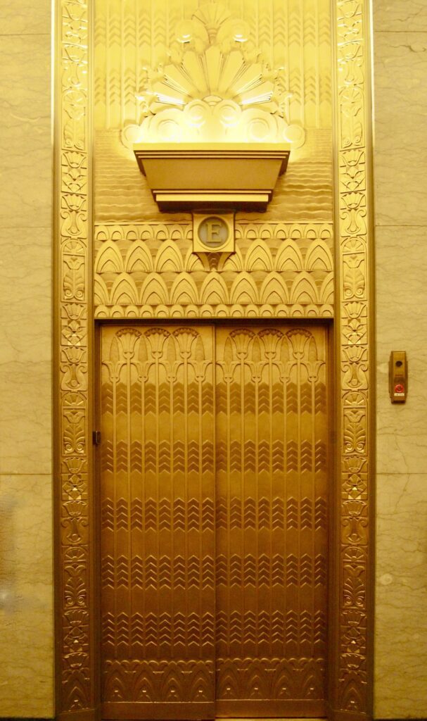 The main entranceway and lobby area is particularly attractive. Decorations seem to be greatly influenced by the interest in Egypt at the time, due to the relatively recent discovery of King Tutankhamen’s Tomb in the 1920s. Brass screens at the main entrance of the building have a lotus flower pattern as well as a dominant Shell Pecten symbol. The lobby is spectacular, especially the multiple elevator doors and surrounds which contain intricate floral and geometric designs, with a gold-coloured finish.