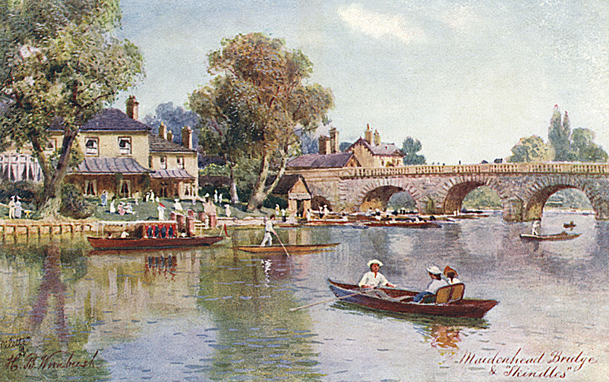 While The Showboat may have been a flamboyant example of its type, it was by no means a pioneer. The genesis of out-of-town clubs and roadhouses of the period lay not in the road but the river, specifically the Thames. The location of The Showboat in Maidenhead was a natural choice. Along with other riverside towns such as Bray, Marlow and Henley, Maidenhead had become a magnet for the social elite since the latter half of the nineteenth century driven by a combination of factors. The towns were picturesque and sufficiently bucolic to revive the spirits of Victorians wearied by the noise and smog of the capital, and yet conveniently close to London to allow a day trip. They were also on the west side of London, the acknowledged smart side, and within the orbit of Windsor and several large houses belonging to social leaders, notably Taplow Court and Cliveden. Many theatre stars also migrated there, choosing to buy or rent summer retreats in the area where they would spend their free time. The variety star Fred Karno even opened his own Thames-side resort, the ‘Karsino’ at Tagg’s Island.