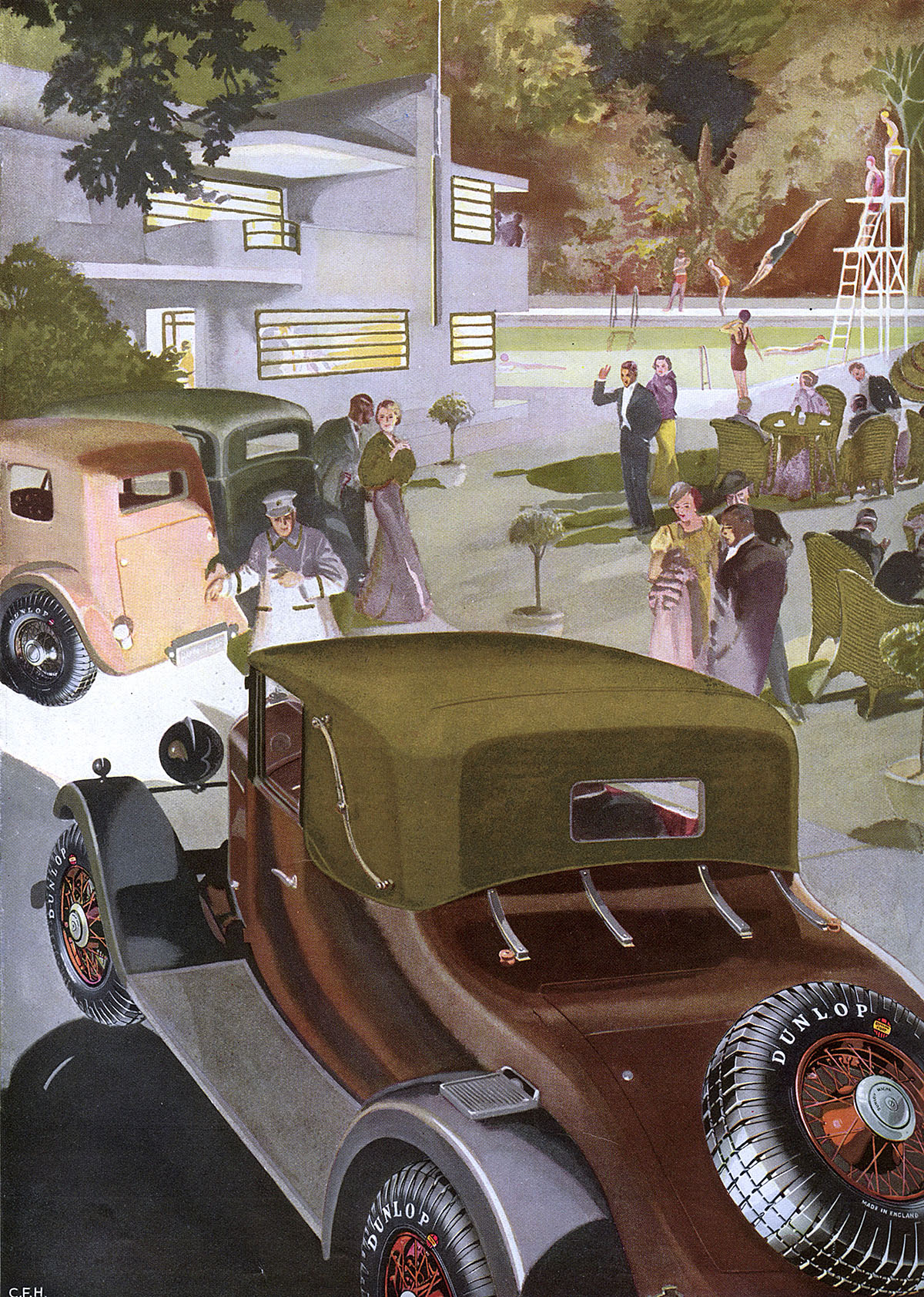 In 1934, British Pathé produced a series of newsreels entitled ‘Outer London Clubs and Cabarets’ featuring guests in swimwear enjoying a carefree afternoon at resorts such as the Hungaria, the Bell at Beaconsfield and the Ace of Spades before tapping their toes at the evening cabaret entertainment. Even if many cinema-goers viewing these scenes felt they would never be part of the so-called ‘enjoyment brigade’, such scenes helped to firmly embed the road house in public consciousness as an aspirational symbol of the era. It seemed natural that commercial brands, particularly motoring companies, would want to ally themselves to the glamour of the out-of-town club. Dunlop Tyres, one of the most prolific colour print advertisers of the twentieth century, ran one advertisement in 1929 (see below) in which a group in elegant evening dress arrive at a modern club, naturally by car, where a pool is visible in the background with swimmers diving under the night sky. A similar advertisement for the Ford V-8 “22” in 1938 further emphasised the contemporary synergy between car and club.