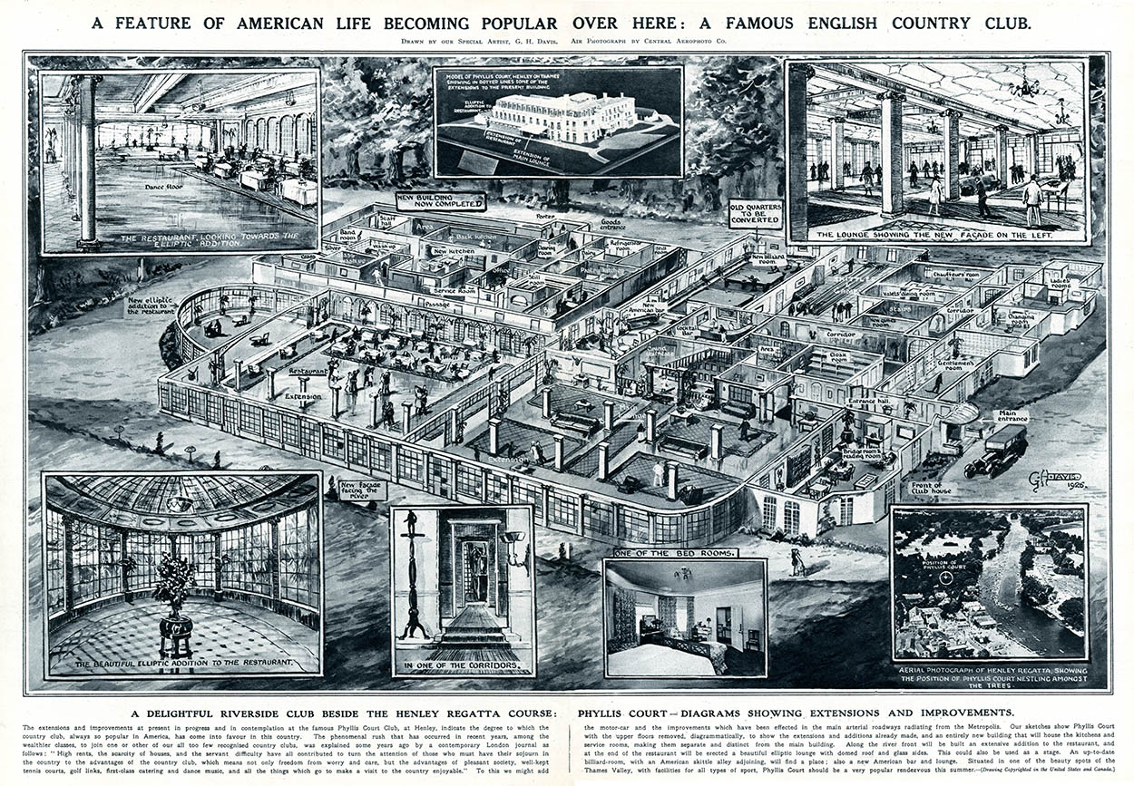 The increasing popularity of rowing meant that clubs dedicated to the sport were established at convenient spots along the river as it idled westwards away from London and into Berkshire. During the summer months, when Henley Regatta and Ascot Sunday were highlights of the social calendar, the draw of the river intensified. The area began to attract families in addition to the original club members and messing about in boats became the quintessential way to spend a leisurely Sunday for the Edwardians. In 1890, Bank Grove at Kingston, formerly a private home, was opened by the Albany Club. According to The Illustrated Sporting and Dramatic News it was, “To afford a pleasant riverside resort for members and their female relatives. The grounds are delightful and have been adapted for lawn tennis etc.” It went on to reassure its readers that, “The club is supported by many good names locally and the first list of members is sufficiently select”. In 1906, Phyllis Court was opened at Henley, a premier spot for viewing the regatta from a specially constructed terrace, but also offering a large ballroom and restaurant, bars and tennis courts.