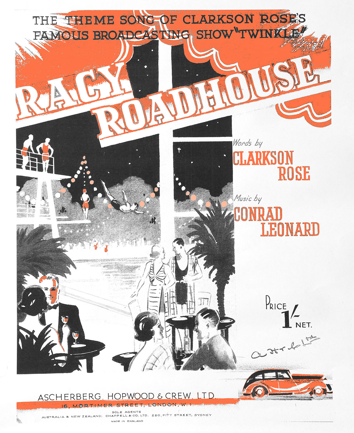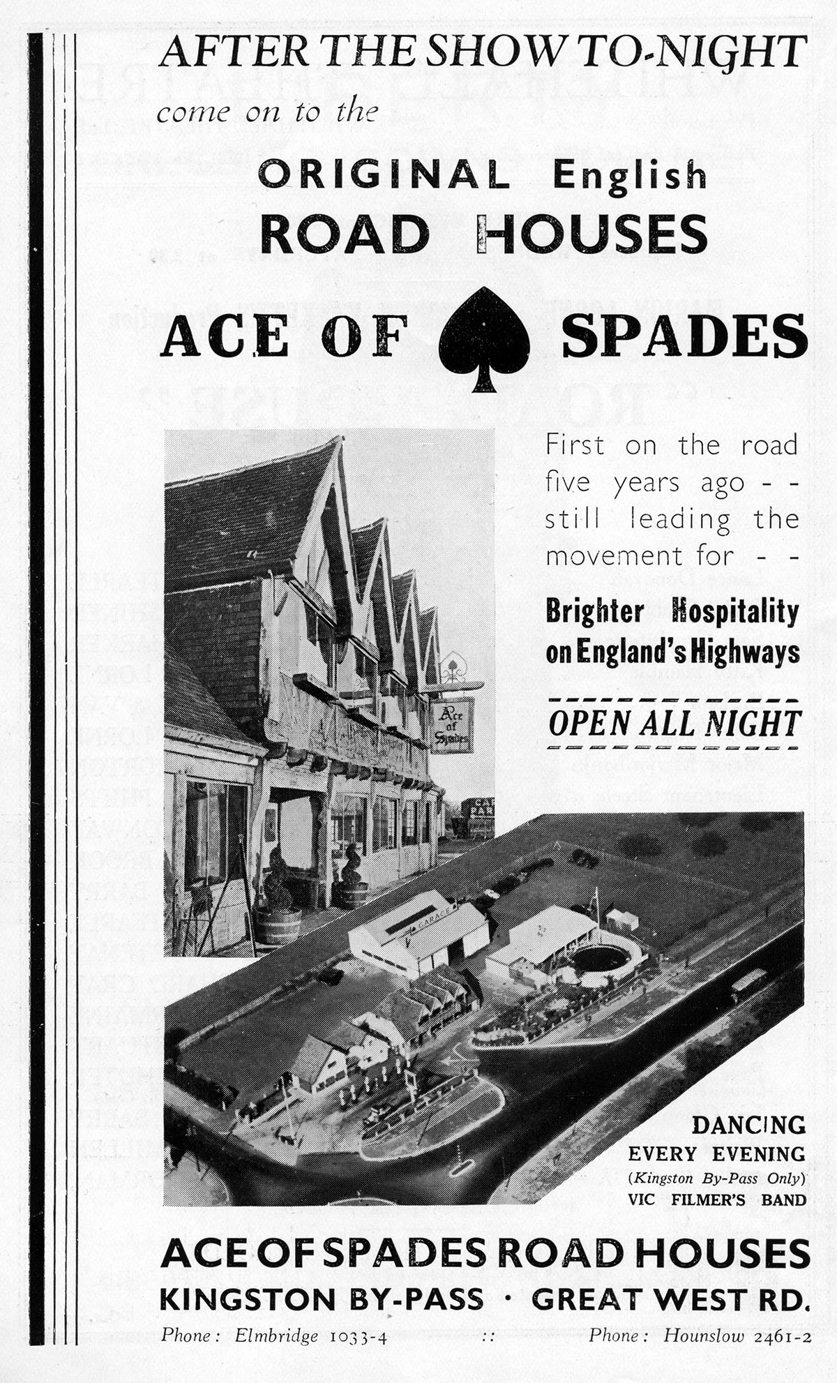 “I went down to the Ace of Spades on the Kingston by-pass the other evening and found the place crowded. It was a cool evening, but the water was so warm that you could see the steam rising and several people stayed in the water for at least half an hour. This roadhouse must be coining money. There is not a table to be had at 10 p.m., or again at 12 p.m., or 2 a.m. which are the three most popular times. The fact that there is no licence means to say that the guests can arrive American-fashion with their own drink – be it champagne, whisky, brandy or what have you. The management provide the food, cabaret, two dance orchestras, and swimming pool, and you do the rest. Up to 9:20pm, they can send out for your liquor locally. After that, as I say, you must bring it yourself.”