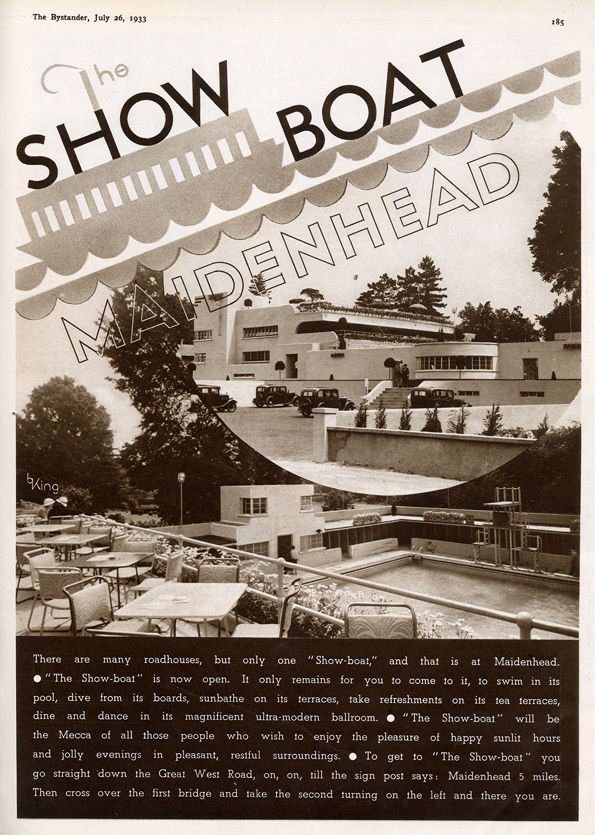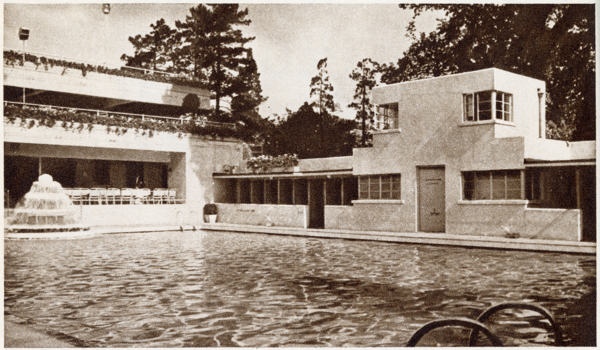 Although the basic concept of food, drink and petrol came from the roadhouse of the United States, as did the cocktails and jazz bands that were often among their attractions, in reality, the early British roadhouse imitated the more selective American country club, and had its home-grown inspiration in the established riverside club of the Home Counties. While some originated as petrol stations, and continued to cater for car owners, with garages, car dealerships and on-site mechanics, these facilities were eclipsed by the addition of restaurants, bars and dance floors, as well the obligatory pool and sunbathing area. By the late 1920s, inspired by wealthy holidaymakers on the Riviera, the suntan craze gripped the nation. The first of these new institutions was the Ace of Spades, which opened on the Great West Road in 1927, and, on a sister site shortly afterwards, on the Kingston by-pass. At the Kingston branch, revellers could dance to Percy Chandler and his band until 3 or 4am, and women who wished to both swim and dance, could take advantage of a make-up department, on hand to groom them into elegant perfection post-dip. It also boasted a polo ground and a private landing strip for the minority of guests arriving by aeroplane, the latter something of a gimmick but one that sparked plenty of column inches, as did a visit by the Prince of Wales. Both venues, like many other roadhouses, were unlicensed. Guests had to bring their own alcohol, but were rarely subject to licensing laws or curfews. Certainly, the inability to buy drinks on the premises did the Ace of Spades very little harm, according to The Bystander magazine in 1933: