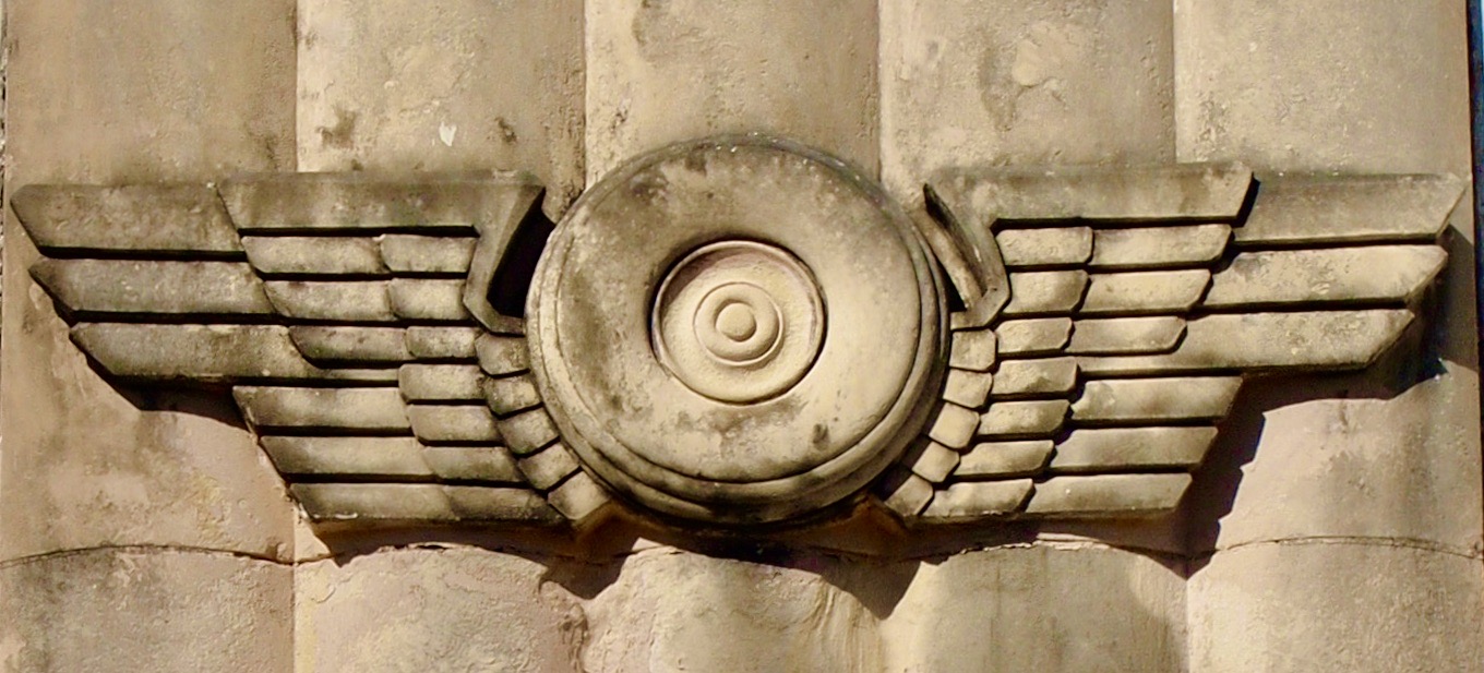 The building consists of a relatively simple multi-story control tower with elongated side extensions. The side extensions exhibit strong vertical lineage and attractive Art Deco reliefs. These repeat around the entire building and depict ‘Aviation; the Origins, the Present and the Future.’ It is interesting how accurately the future of flight was predicted in the vertical take-off aircraft depicted. Above the main entrances is a stunning relief depicting the Roman God Mercury. Winged and wearing an aviator helmet, he holds aloft a Dove of Peace and a Torch of Knowledge. A stylized aircraft tire relief, with wings, decorates the side entrances to the building. Local Texas artist Dwight Holmes was contracted to provide the aviation-themed reliefs.