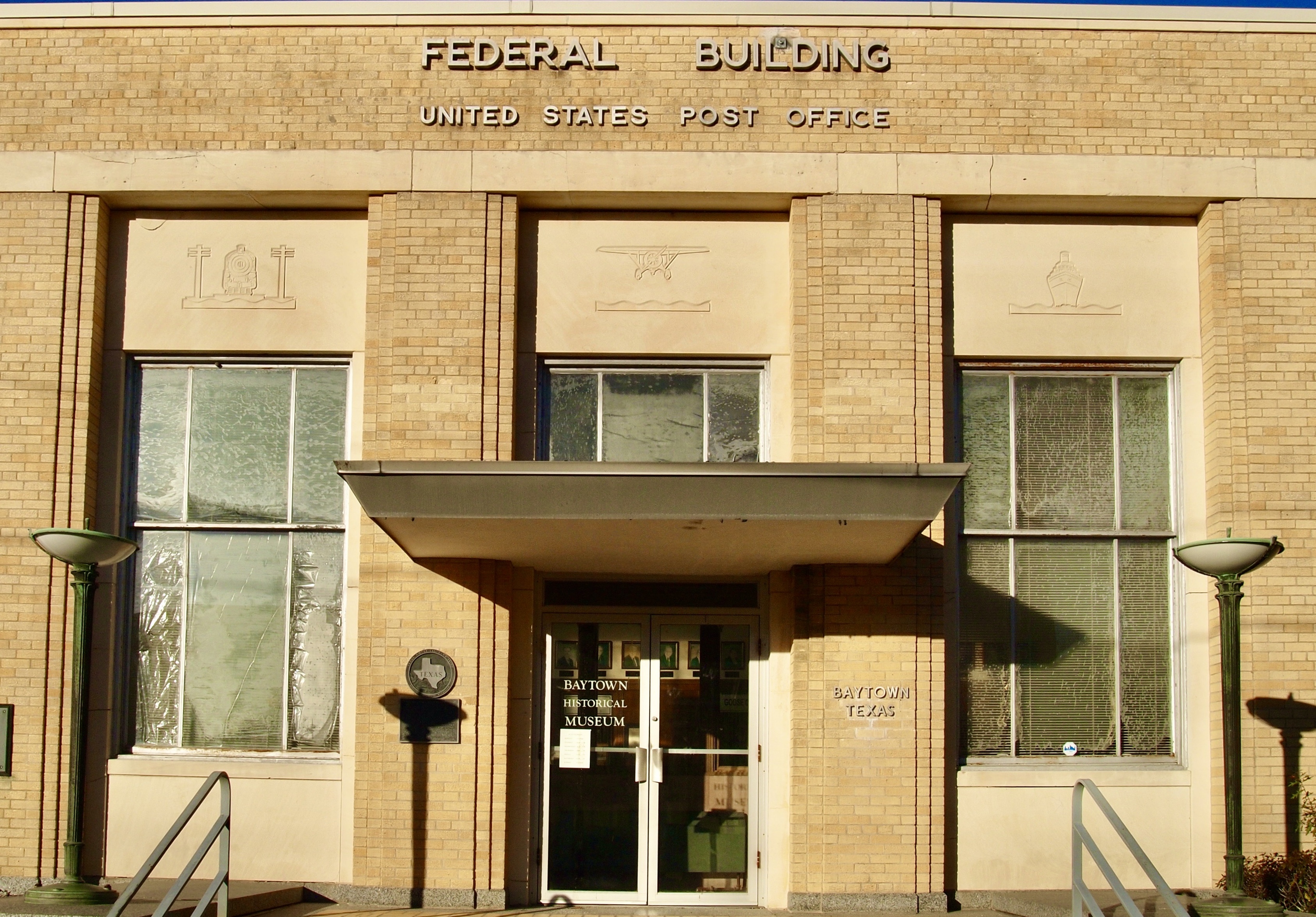 Nearby to the Brunson Theatre is another repurposed Post Office, now the Baytown Historical Museum. Described as being built in an ‘early international style’ in the mid-1930s and designed by architect Louis A. Simon. Perhaps the most interesting features, as with the Brunson Theatre, are the decorative, stylized illustrations above the doorway and windows. These once again depict Baytown’s heritage with images representing railways, aviation and shipping. Or possibly they are more simply related to methods the Post Office used to move mail.