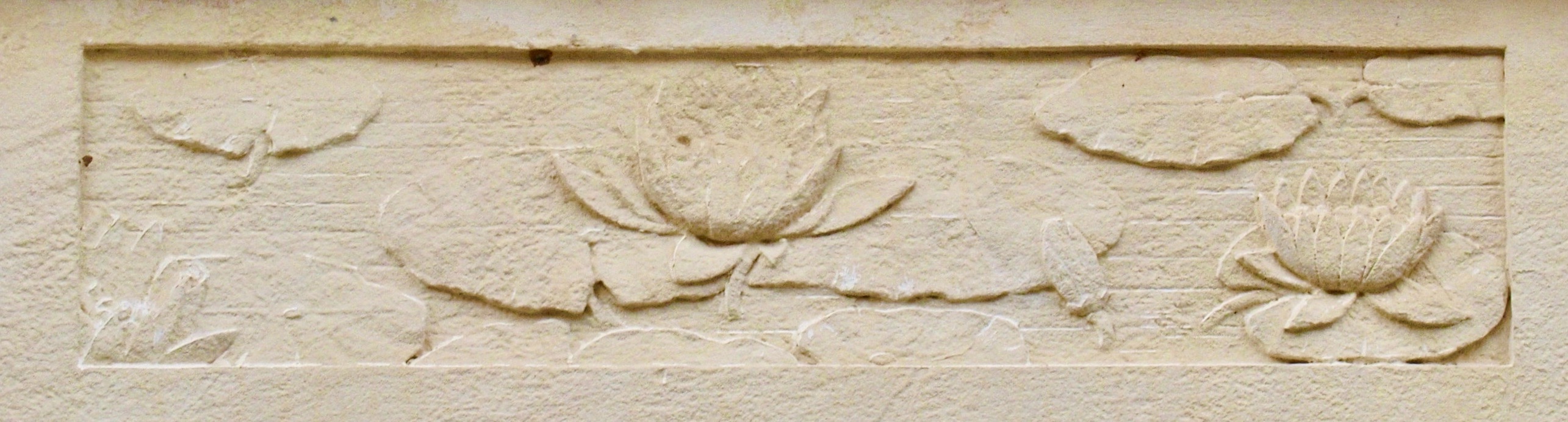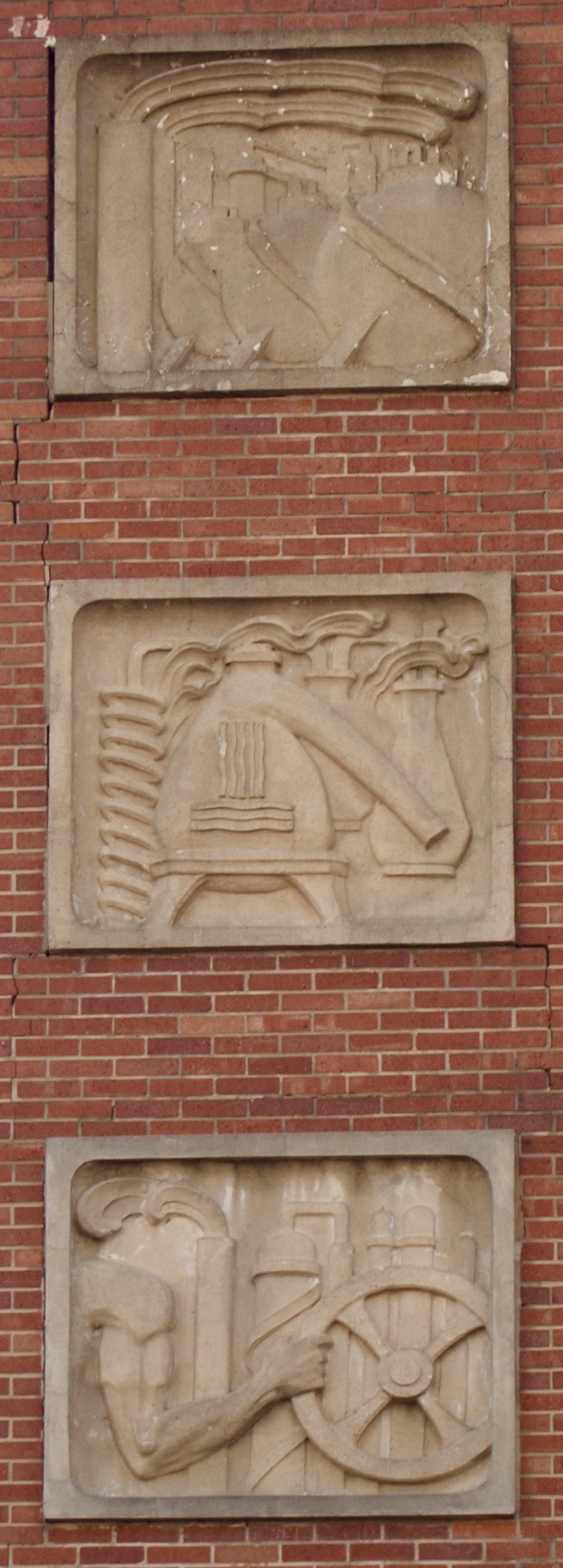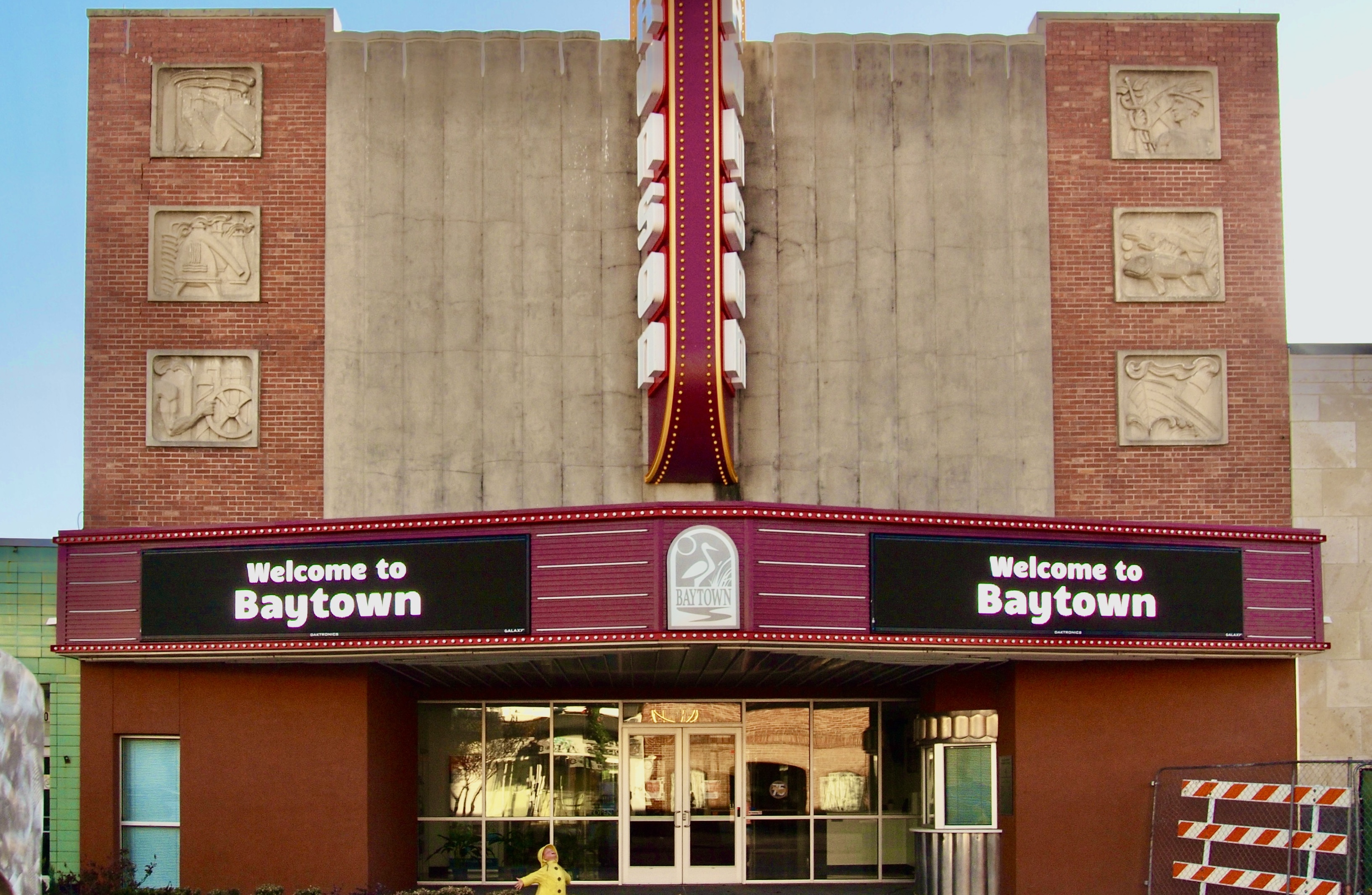 The front of the building consists of brick end panels and a central expanse of limestone fluting, bisected by the theater’s vertically aligned sign. The brick panels are fitted with decorative limestone reliefs by artist Rudolph Wagner. These pay tribute to the sources of Baytown’s wealth, depicting local industries and maritime businesses. Closed for many years since the mid-1980s, the building is now renovated and reopened as the Baytown Visitor Information Center.