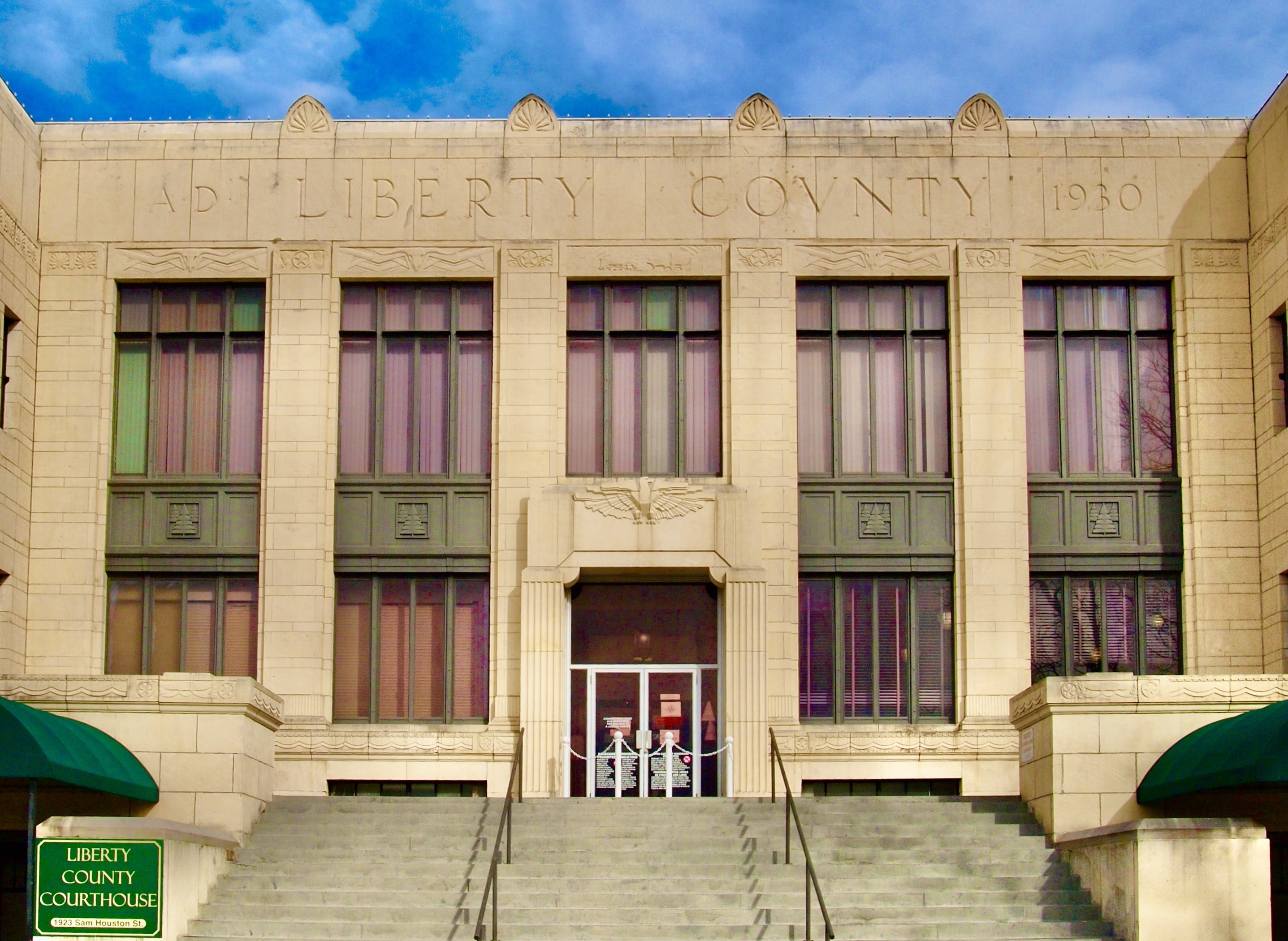 The town of Liberty, some 45 miles west of Houston, has had many courthouses over the decades. The current building is the seventh and is still in use today. It was built between 1929 and 1931 in the Moderne style which was becoming popular at the time. The design was by the architects Cornell Curtis and A. E. Thomas, who designed several courthouses in Texas. The main construction material is Texas Cordova Limestone. The courthouse has an impressive frontage; columned, with Art Deco decorative features. These are also replicated on two sides of the main building. The strong geometric lines of the building are in keeping with the decorative Art Deco style depicting western, patriotic, agricultural, and industrial themes.