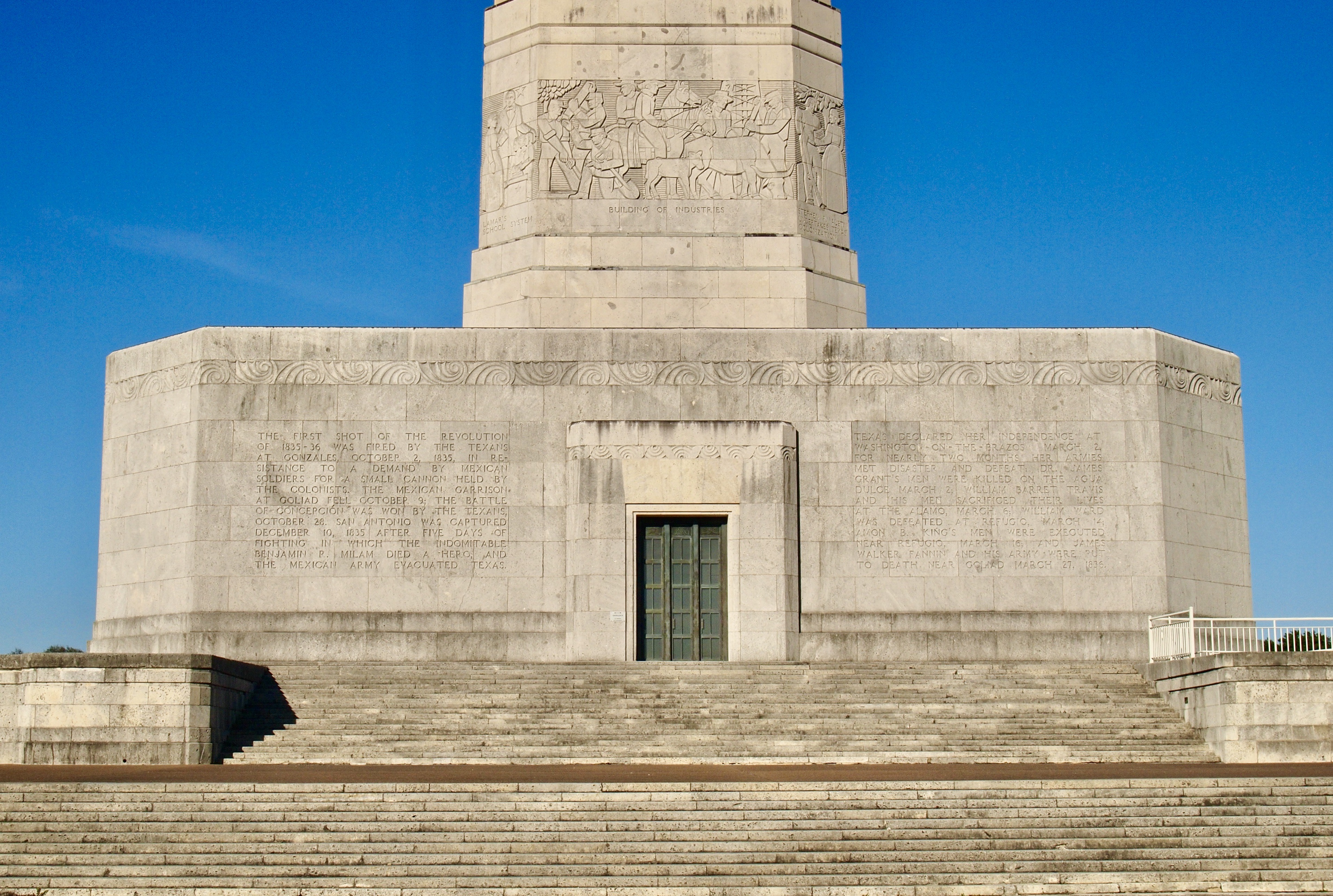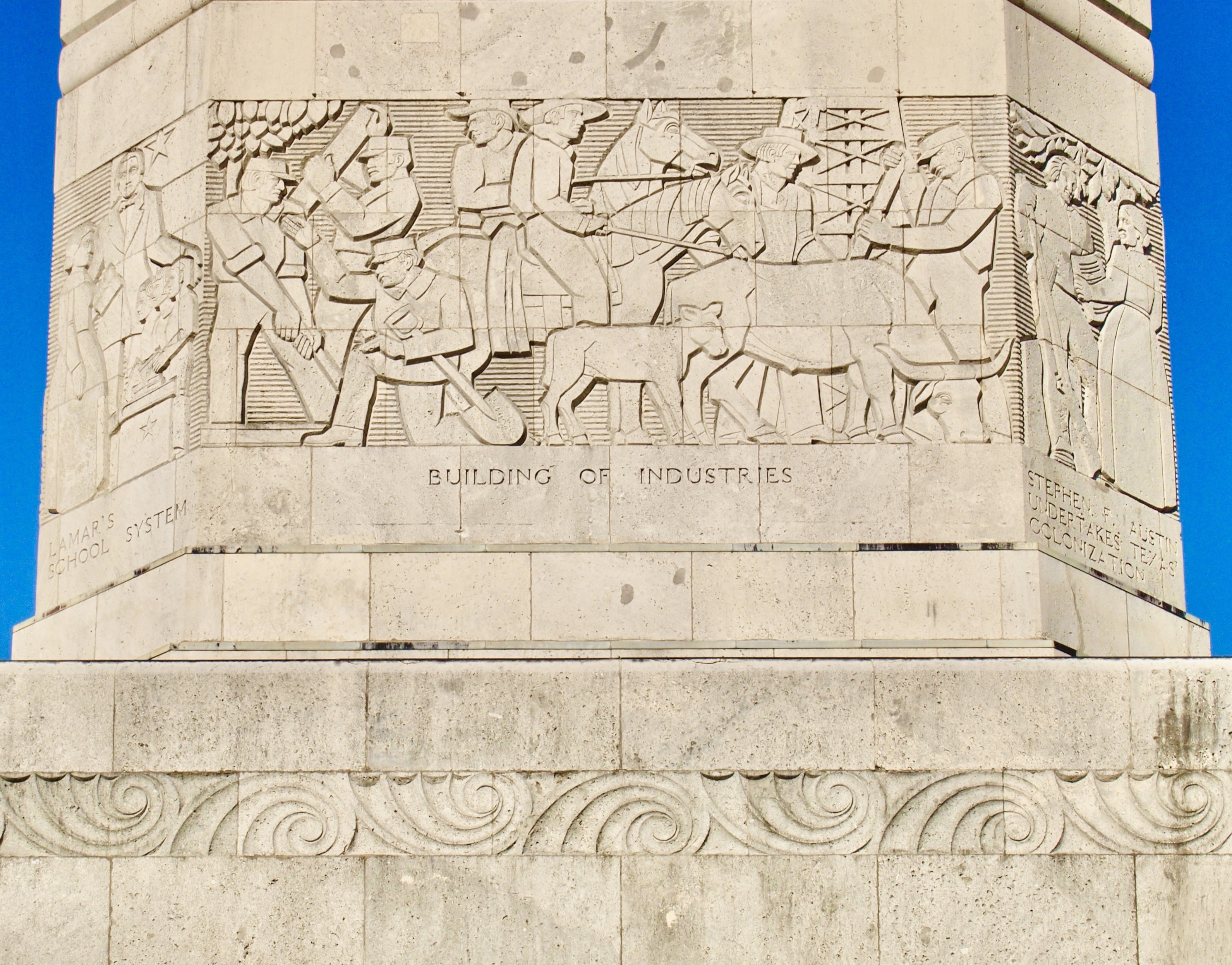 The lowermost part of the monument consists of eight carved panels, depicting the history of the Battle of San Jacinto as well as Texas culture, business and heritage. These illustrations, designed by William McVey, exhibit strong Art Deco stylistic features with simple, minimal lines depicting people, activity and events. Below the panels, at the entry-level to the monument, are walls of carved text describing the story of the birth of Texas. Numerous Art Deco features are present at this level including a curvilinear decorative motif about the text and doorways. The ‘Six Flags of Texas’ are also depicted at the bronze entranceway to the internal Museum.