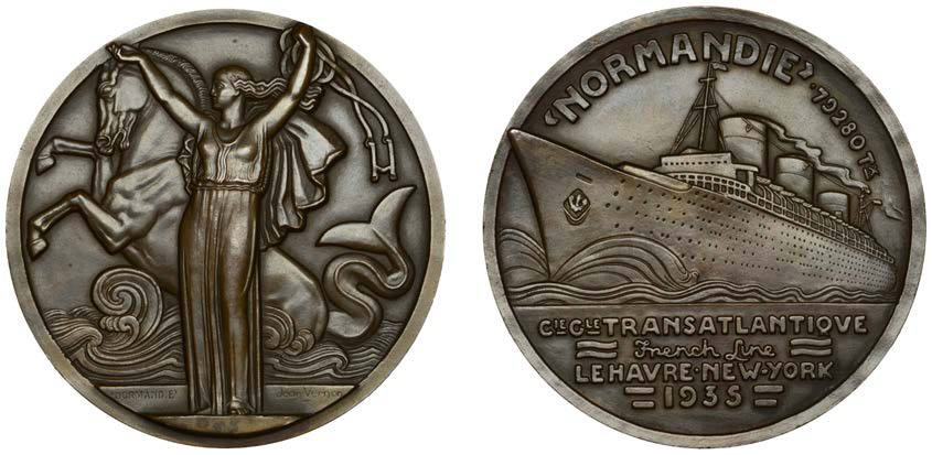 I was at an antiques fair in 1995, and I saw a dealer with his table covered with various commemorative medals. On returning home I regretted not buying one I had seen. Its powerful image on both the obverse and reverse made a big impact on me. I tracked the dealer down and invited him to bring the Normandie medal and others to my house. I had bought my first Art Deco medal, and it commemorated the 1935 launch of the French liner Normandie. This was issued by Compagnie Générale Transatlantique.