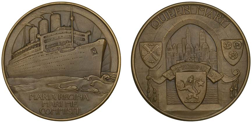 The Normandie led to other ships having commemorative medals and the British 1936 Maiden Voyage of the RMS Queen Mary was celebrated in a medal by Gilbert Bayes. Three thousands of these were issued by the Royal Mint at 15 shillings (75p) each. In 1997, I paid £150 for mine, but in 2025 it sold for just £110 – a loss of 27%!