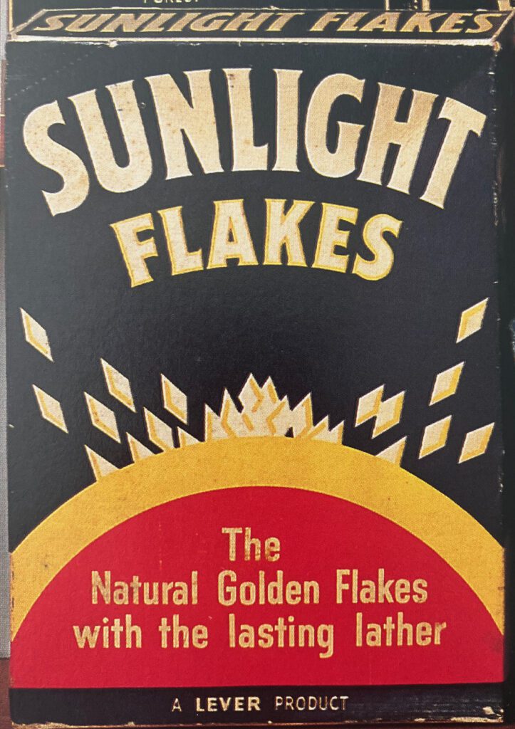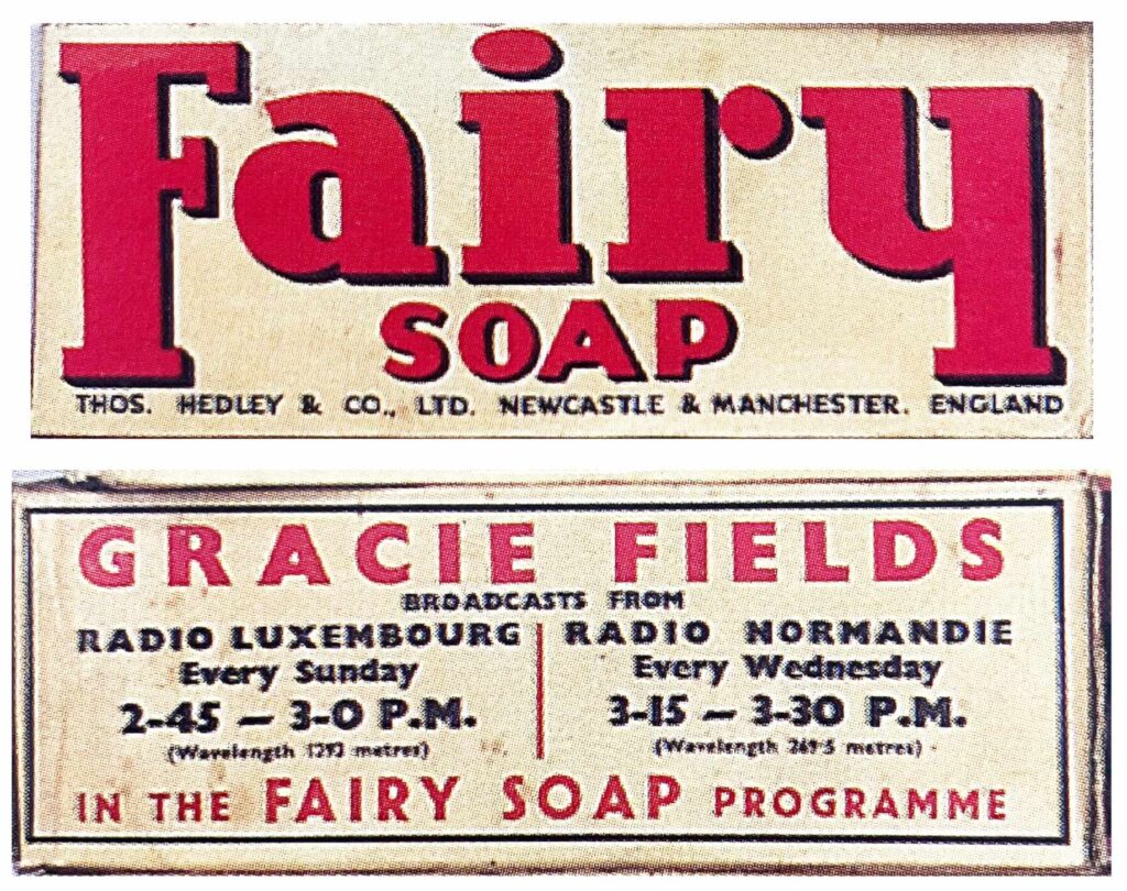 Soap packets are another place where we can see strong Art Deco influences. Lever Brothers and Pears had led the way in advertising soap in the late nineteenth century, and they had nearly forty years of experience of branding goods by the interwar period. This also forced other manufacturers to be inventive in their branding. Sunlight Soap in particular drew on modern themes for its boxes such as the one below. The stylish box below is not only eye-catching, but shows that this is a modern, easy to use product. Fairy were also keen to show how up-to-date they were: in the below image it is not the look of the box which does this, but the promotion of the “Fairy Show” on the radio. Not only was this state-of-the-art technology, but it was also hosted by the foremost British star of the day, Gracie Fields.