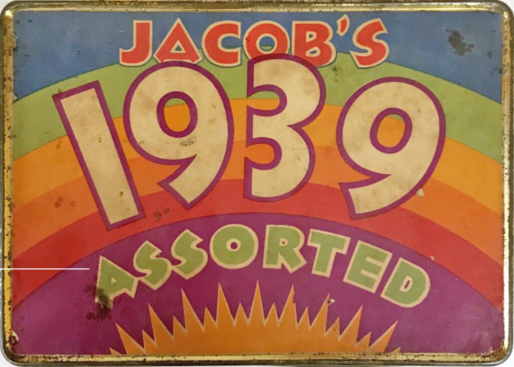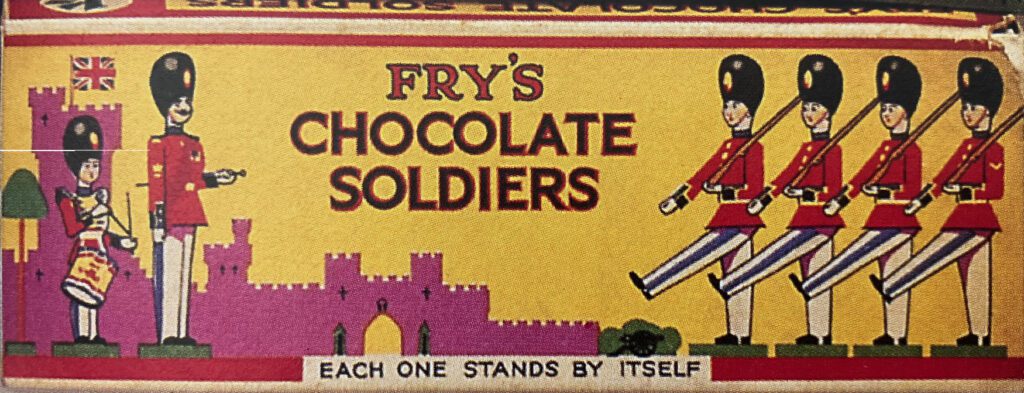 When it came to food, it tended to be the non-essentials where we see the most Art Deco style boxes and tins. Presumably this is precisely because they weren’t essential goods, and the consumer needed extra persuasion to buy them. The Fry’s chocolate soldier box below is brightly coloured and designed to appeal to boys who probably played with toy soldiers. The wrapper even tells the potential purchaser that the soldiers can stand up! It takes traditional imagery of soldiers and a British castle, but they are rendered in a simple and modern style.