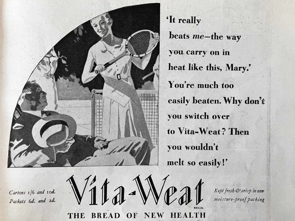 This was also the era when brand names began to be created from scratch. Whereas brands which had developed in the nineteenth century had tended to be family names, such as Rowntree’s or Colman’s, by the early twentieth century was a trend towards descriptive and onomatopoeic words: Krusto, Bisto, Vita-Weat, Aero. These cutting-edge names were recognisable and easy for consumers to pronounce. Additionally, the adverts and packaging for these products used images and text which implied the goods were modern, practical and convenient.